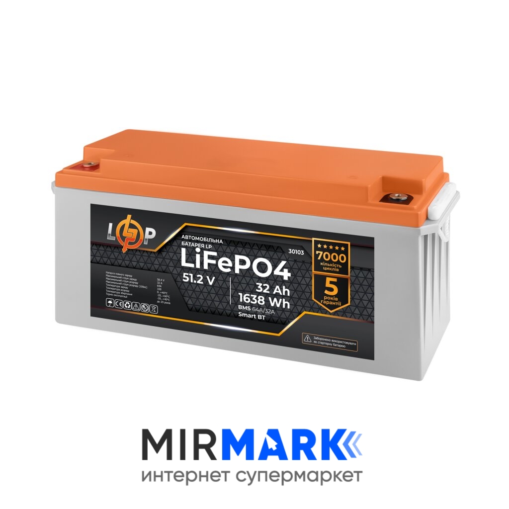Описание на Аккумулятор LP LiFePO4 51,2V - 32 Ah (1638Wh) (BMS 64A/32А) пластик LCD Smart BT: