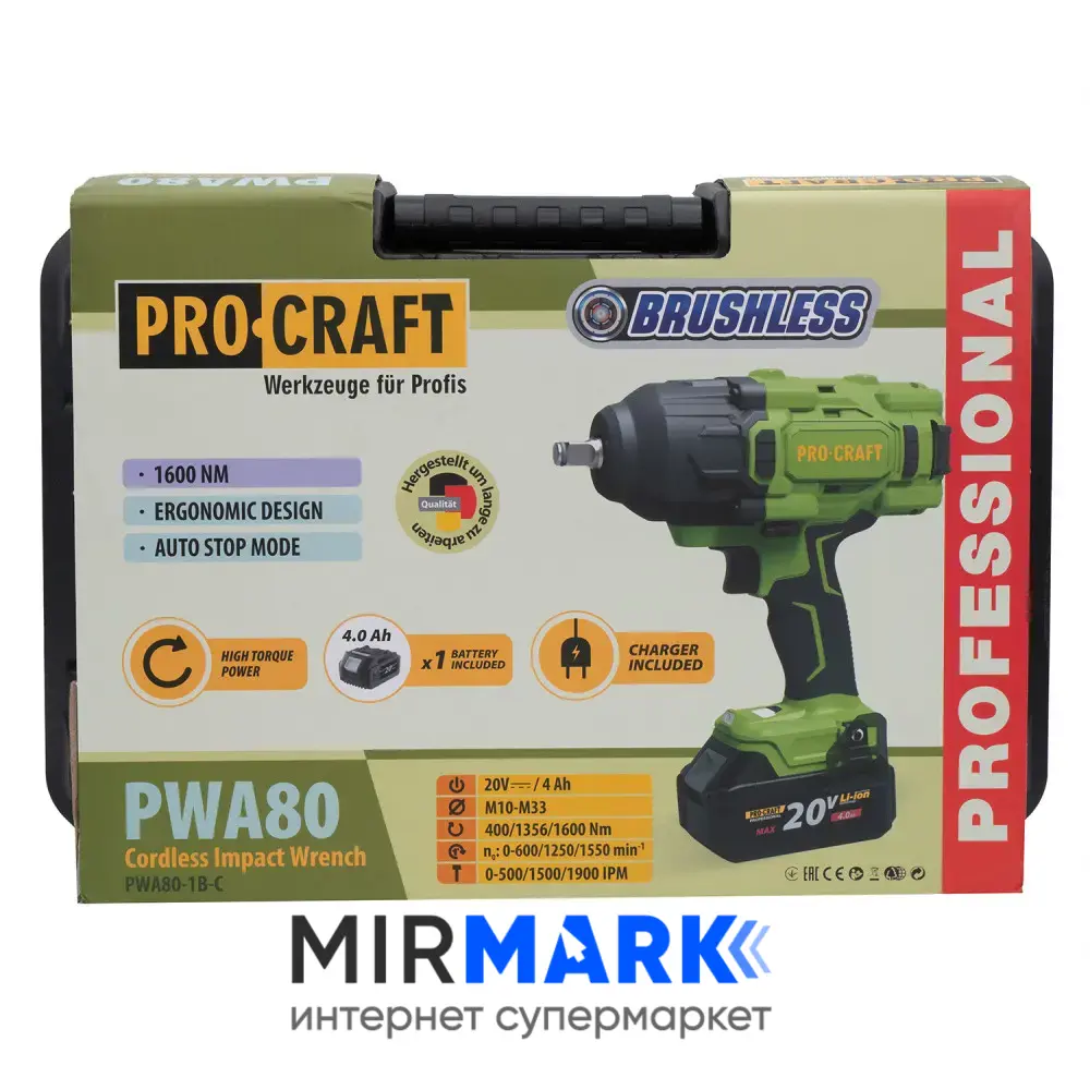 Описание на Аккумуляторный гайковерт ProCraft PWA 80 АКБ и ЗУ + кейс: