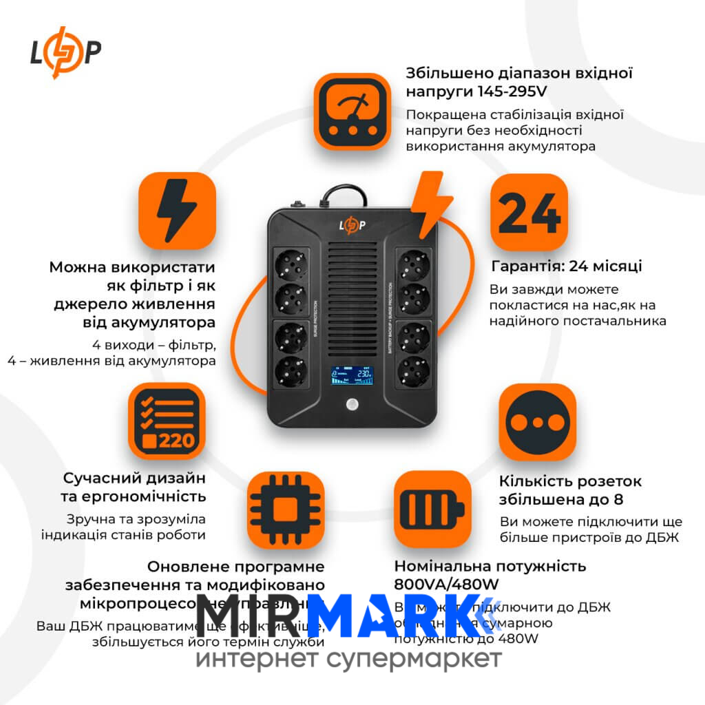 Описание на Источник бесперебойного питания LogicPower LP-800VA-8PS 480Вт линейно-интерактивный: