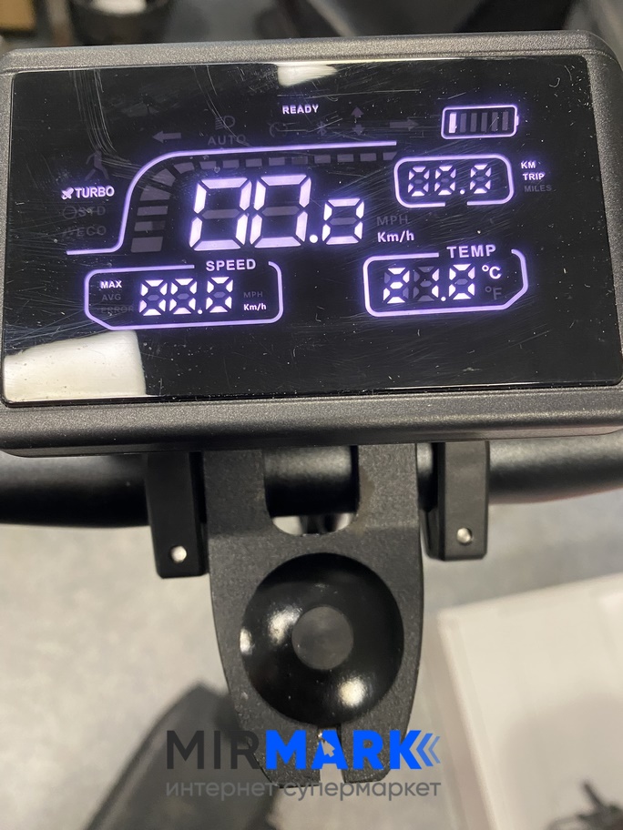 ЛСД дисплей показывает текущую информацию: состояние заряда, скорость и выбранный режим езды. Управление электросамокатом осуществляется с помощью удобно расположенных кнопок на руле. Они позволяют вам запускать самокат, подавать звуковой сигнал при движении, и включать фару в ночное время.