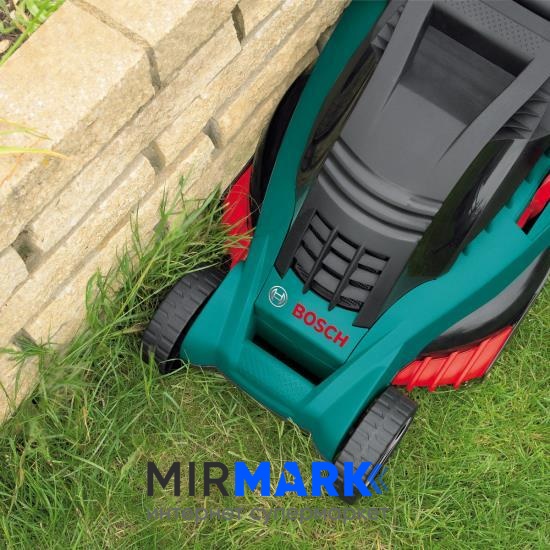 Оснащена косилка Bosch Rotak 32 малошумовым электрическим мотором, мощность которого = 1,2кВт. Режущие элементы устроены таким образом, что специальное направляющее подгоняет траву прямо к ножу. С легкостью скосит даже высокую и мокрую траву. Быстро вращающиеся ножи создают довольно сильный поток воздуха, который с легкостью затягивает траву в 31-литровый травосборник. Травосборник без больших проблем снимается и легко моется. Мульчирования и бокового выброса у косилки нет, но несравнимая легкость, компактность и мобильность превращают косилку в найудобнейший садовый инструмент.