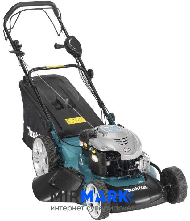 Бензиновая газонокосилка Макита PLM 5102 имеет опцию самохода, которая движет машину вперед, оператору нужно только задать направление движения. Работает механизм производительно, от 4х-тактного мотора B&S (тип 675 Readystart) мощностью 3,2л.с., а интенсивной длительной эксплуатации способствует вместительный 65-литровый травосборник.