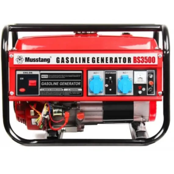 Модель генератора MUSSTANG BS3500 c ручным статером. Эта модель, пожалуй, самый лучший вариант с точки зрения соотношения первичных денежных затрат на покупку и фактического потенциала по обеспечению Ваших обязательных к использованию потребителей. Вольтметр, две розетки и блок регулирования напряжения входят в стандартную комплектацию. В содружестве с 15-ти литровым баком это предполагает продолжительность работы без дозаправки до 9,5 часов. При этом габаритные характеристики генератора весьма весьма компактные, что расширяет возможности его использования не только в стационарном домашнем варианте. В итоге, Вы можете получить правильное сочетание требуемых параметров, функциональные возможности по приемлемой стоимости, которая не завышена по причине узнаваемости бренда и количества лет присутсnвия на рынке. При правильной эксплуатации генератор будет служить весьма продолжительный период времени.