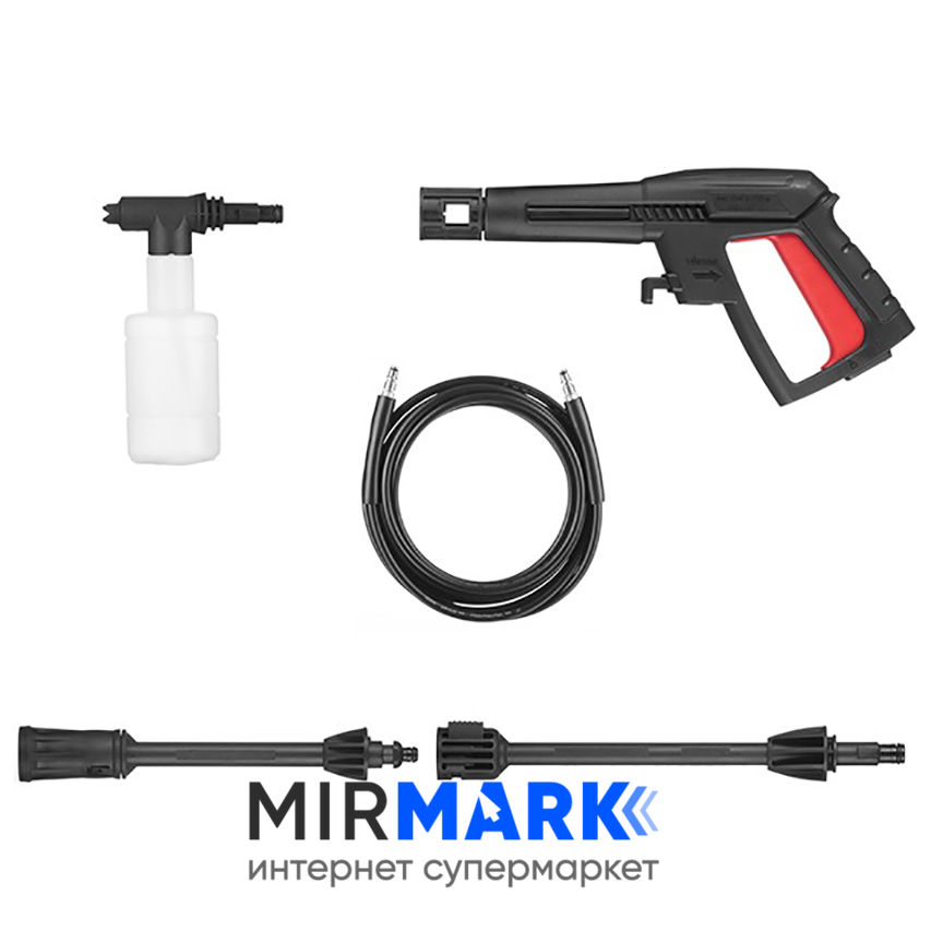 пистолет; шланг высокого давления 5 м; насадка пенная; дополнительный фильтр тонкой очистки; игла для прочистки сопла; руководство пользователя; гарантийный талон