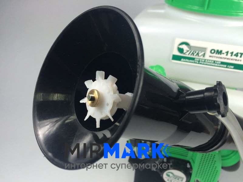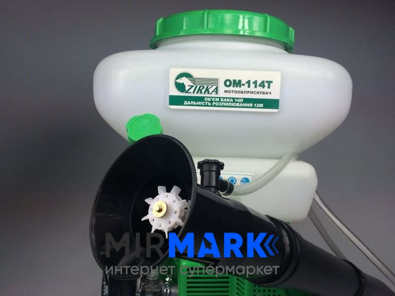 Мотоопрыскиватель Zirka ОМ-114Т - очень эффективен в обработке насаждений как жидкими, так и сухими пестицидами, по распылению гранулированных и жидких ядохимикатов и удобрений против заболеваний флоры и для обезвреживания от паразитов. Раствор распыляется мелкими каплями потоком воздуха на большой скорости, а сама конструкция предусматривает нагнетание дополнительного давления в баке, для обработки достаточно высоких растений. Рычаг управления мотоопрыскивателем находится на раструбе, для удобства оператора.