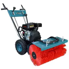 - Бензиновая дорожно уборочная машина подойдет для тех кому нужна высокая производительность. Вращение щеток, как и движение машины, обеспечивается за счет тяги двигателя внутреннего сгорания, что дает большую производительность, увеличивает скорость уборки, делает ее проще.