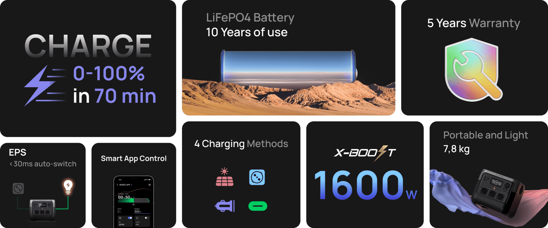 Аккумуляторы LiFePO4 отличаются надежностью и сроком службы до 10 лет. Прибор серии RIVER 2, работающий от модернизированной долговечной батареи LFP, может заряжаться и разряжаться более 3000 раз. Это соответствует почти 10 годам ежедневного использования, что в шесть раз дольше, чем в среднем по отрасли. Аккумуляторы серии RIVER 2 безопасны, долговечны и высокоэффективны даже при теплых температурах.