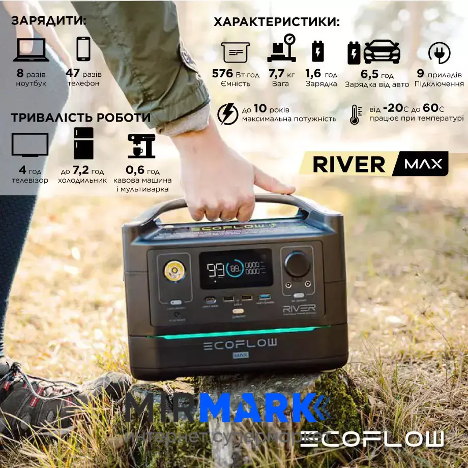 Описание на Портативная зарядная станция EcoFlow RIVER Max (576 Вт·ч), 600 Вт, 576Вт/час, Li-NCM: