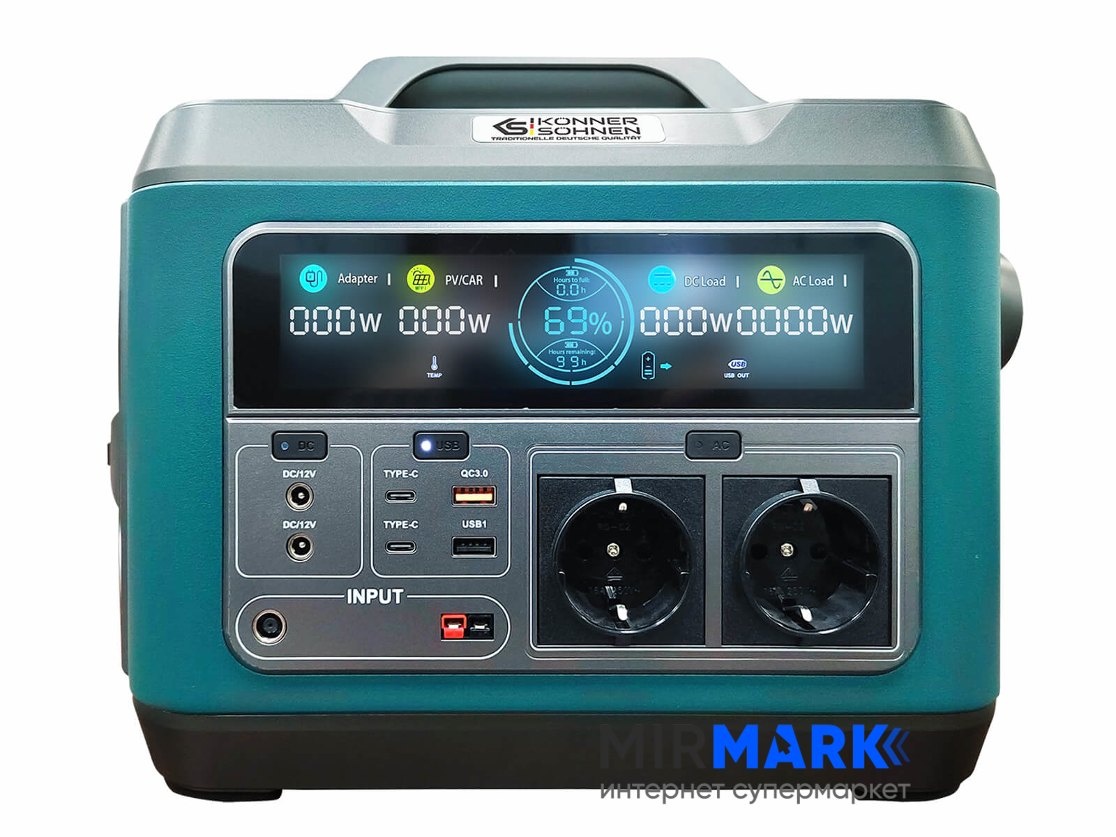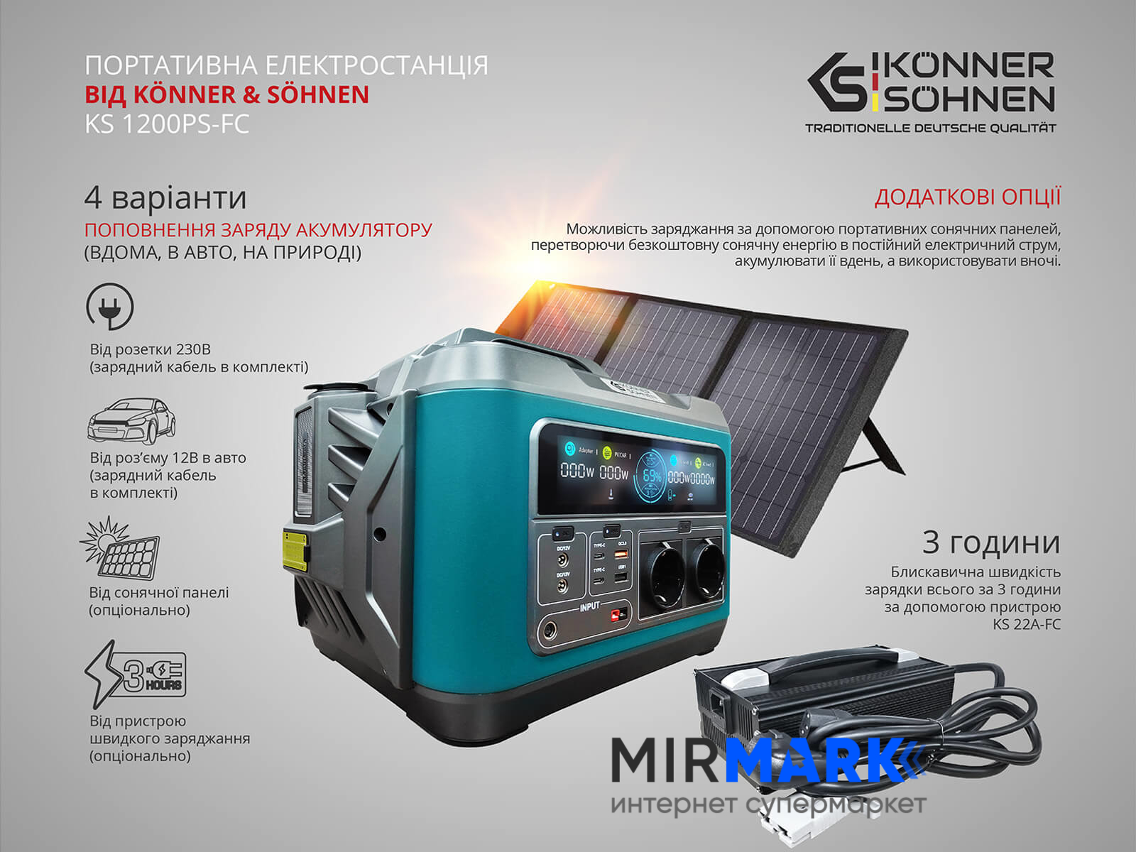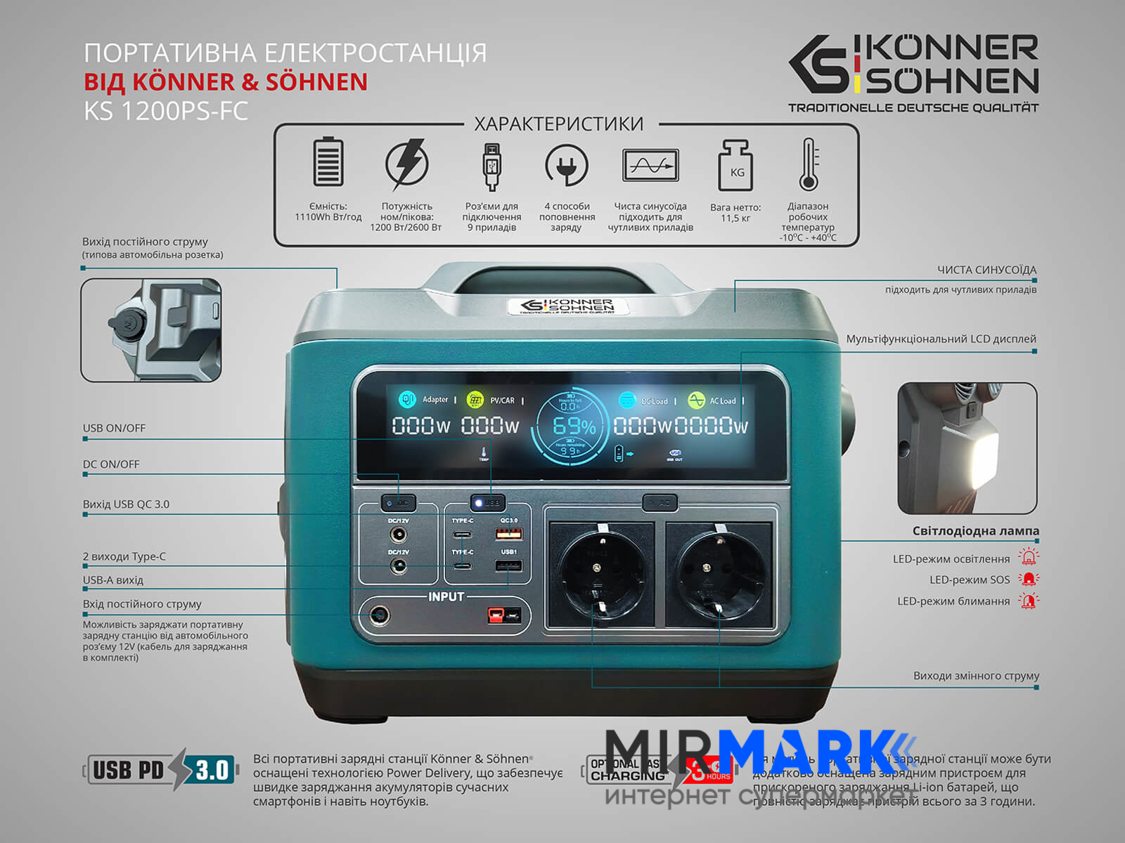 Портативная зарядная станция Konner&Sohnen KS 1200PS-FC, 1200 Вт, 1110Вт/час, Li-Ion (литий-ионный)