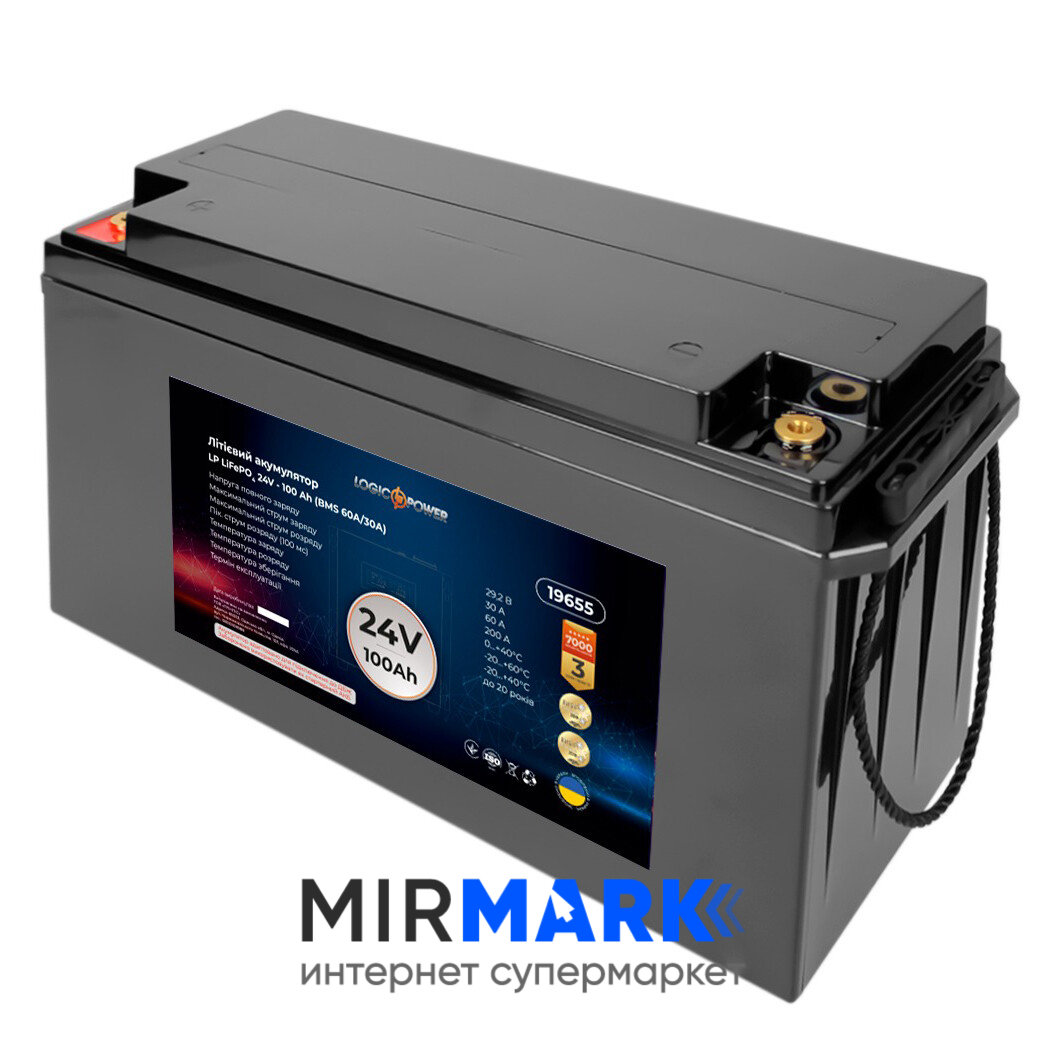 Акумулятор для ДБЖ LiFePO4 24V-100 Ah BMS 60A/30А від високотехнологічного українського бренду LogicPower забезпечує безперервну роботу різних категорій споживачів (крім автомобільних стартерів) при відключеннях стаціонарних електричних мереж. Зносостійке обладнання розраховане на інтенсивне багаторічне використання (до 7 тисяч робочих циклів).