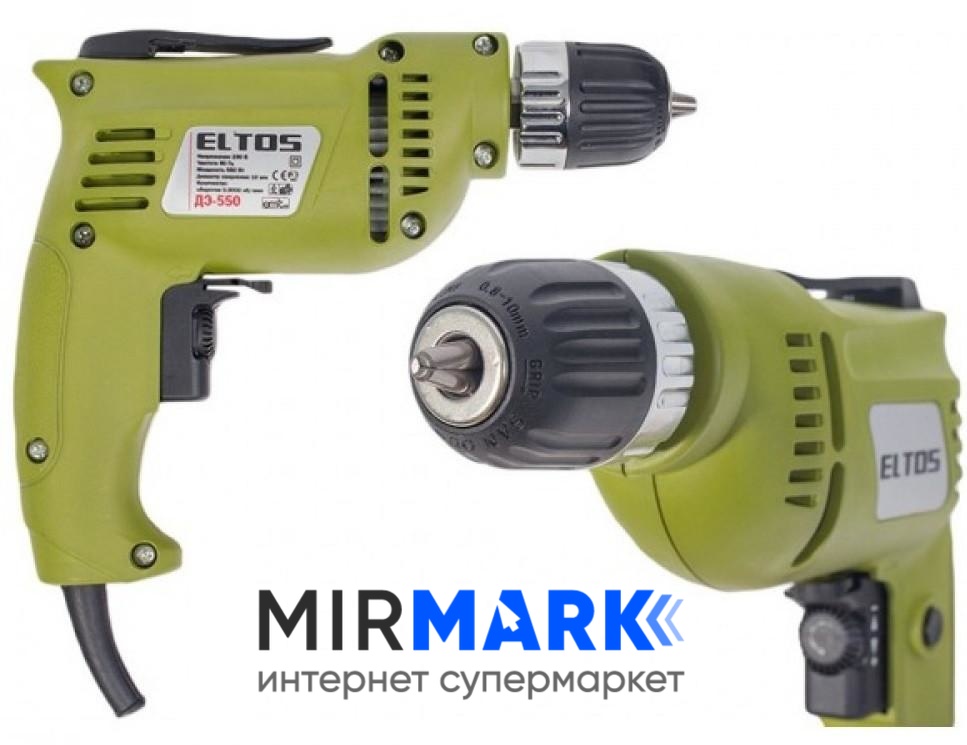 - Дриль Елтос ДЕ-550 — це мережева модель з довжиною шнура в 2.5 кг. Тому за тривалістю 1 циклу робіт користувач не обмежений, безперервне харчування забезпечується при підключенні до однофазної розетки 220В.