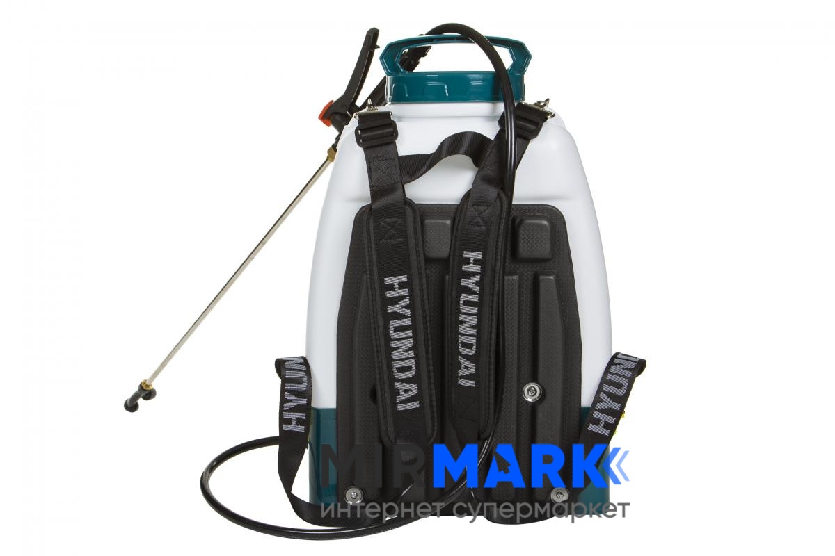 Двигун працює від акумуляторної Li-Ion батареї місткістю 8 Ач, що дозволить працювати з пристроєм без підзарядки до 4 годин. Фірмовий АКБ від Hyundai позбавлений ефекту пам'яті, а повний цикл заряду батареї займає до 8 годин. Обприскувач обладнаний ударостійким пластиковим баком на 16 літрів. При середньої продуктивності цілком вистачає обробити територію до 40 соток. Радіус розпилення становить 2.5 метра.