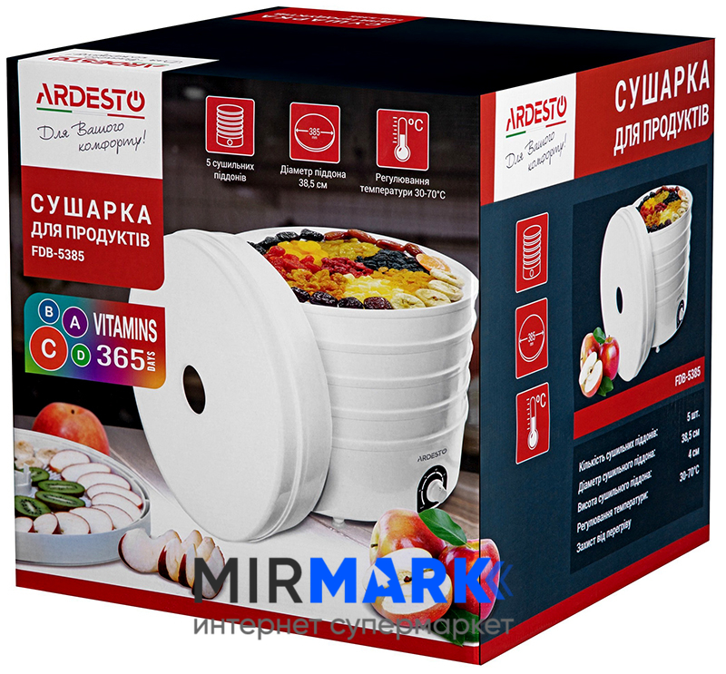 Опис на Сушарка для продуктів Ardesto FDB-5385, 520Вт, піддонів -5x4см, діаметр-38,5см, регулятор температури, пластик , білий: