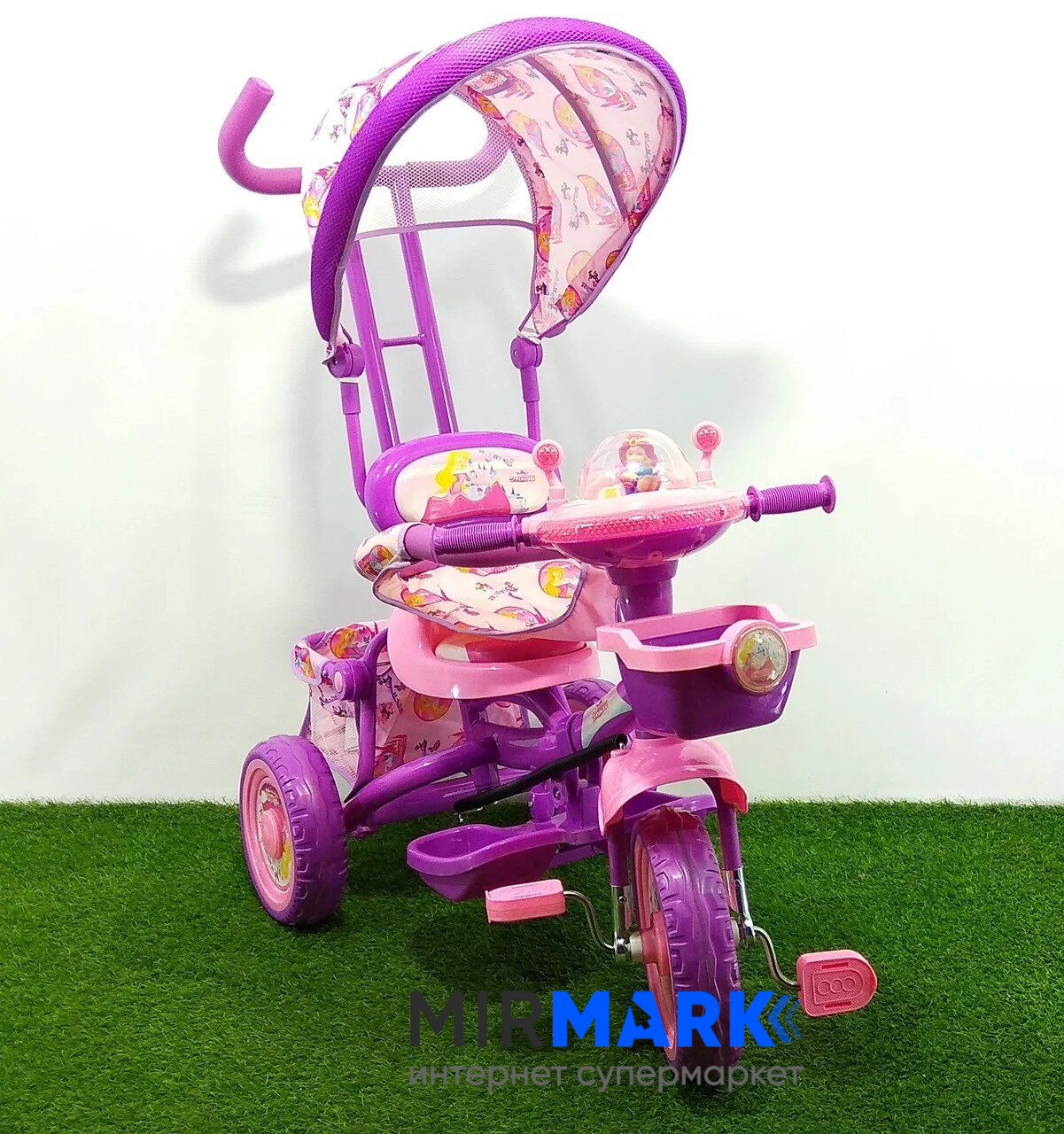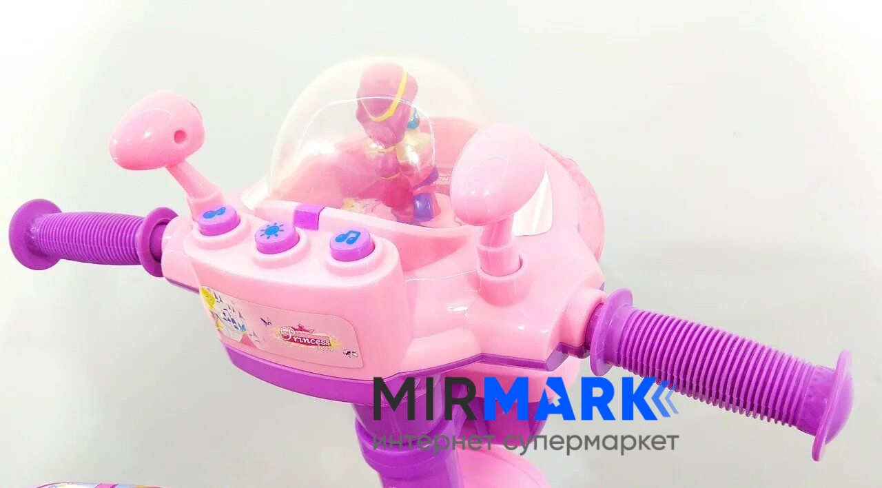 захисний вкладиш для сидіння (трусики)+розкладний козирок+кошики+підніжка+регульована по висоті батьківська ручка (метал)+музична панель зі світловими та музичними сигналами+ шестигранник для встановлення керма